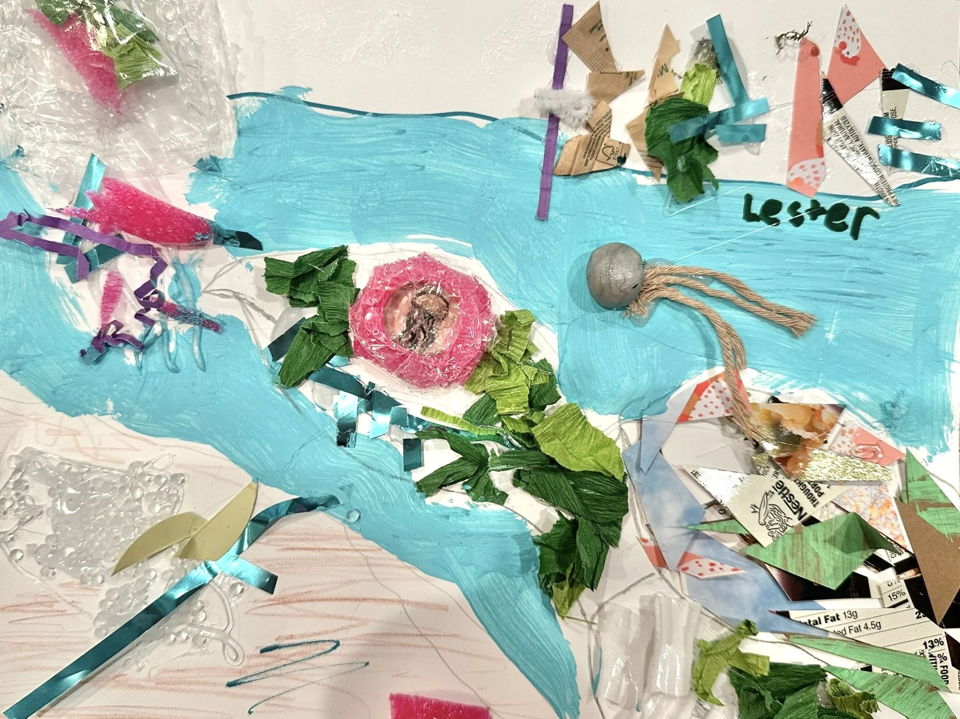 Blake Lester, "Ocean Recycle" (Paint and found materials on paper, 2024)